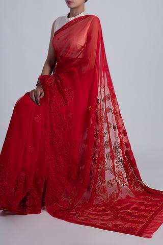 Here, Manasvi sat adoring her daughter-in-law’s thoughtful gift: a bright red chiffon saree with intricate chikan embroidery with lipstick in a shade of bright maroon and matching bangles to go with it. Manasvi berated herself for ever doubting Sonali, the girl had made an effort at understanding her, which no one in her family had ever done.